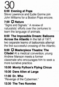- 23, 30 November, 7 December 1986: The War Games airs in three parts; WTTW created its own version of the serial so it could screen over three weeks; "Part One" was episodes 1-3, "Part Two" was 4-6, "Part Three" was 7-10. (Most other stations aired the story as a 2-part omnibus consisting of eps 1-5, then 6-10.)
